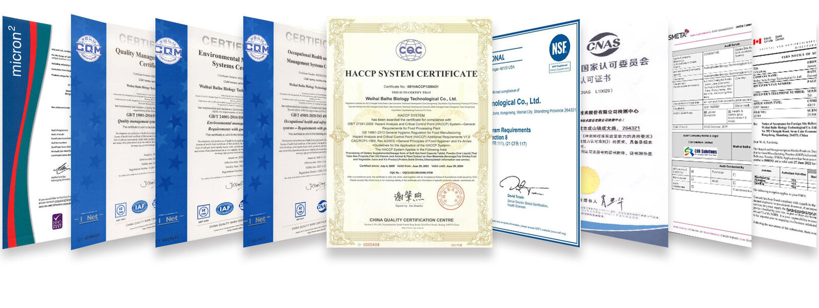 Weihai Baihe Biotechnology Co., Ltd., se estableció en 2005 y ha recibido sucesivamente las múltiples certificaciones del sistema de gestión de calidad y el registro de marcas comerciales reconocidas, como certificaciones de calidad ISO, NSF, registro de la FDA de EE. UU., número de registro de pesca de la UE, BRCGS, HACCP, FSRN, Smeta, etc. La empresa puede producir más de 10 formas de dosificación como cápsulas blandas, cápsulas duras, tabletas, polvos, gotas, bebidas embotelladas, refrescos, líquidos orales, gomitas, etc., y más de 4.000 tipos de productos alimenticios de nutrición y salud, que se exportan a más de 70 países y regiones, incluida Europa. Estamos comprometidos a continuar liderando la industria con productos de alta calidad.