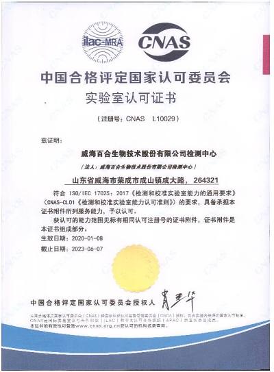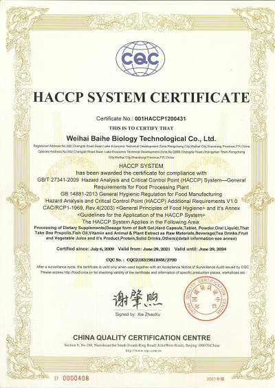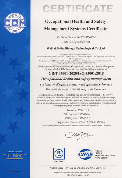 La compañía ha pasado sucesivamente la certificación de fábrica NSF, el registro FDA, la certificación BRCGS, la certificación HACCP, el registro de productos acuáticos de la UE, el registro FSRN de Canadá, la certificación Smeta y otras certificaciones o registros de sistemas de gestión conocidos en el país y en el extranjero.