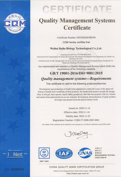 La compañía ha pasado sucesivamente más de diez certificaciones y registros de sistemas de gestión bien conocidos en el país y en el extranjero, y ha trabajado en estrecha colaboración con cientos de clientes en el país y en el extranjero. Desde productos nutricionales convencionales como aceite de pescado, fosfolípidos y vitaminas hasta nuevas formas de dosificación y nuevos productos nutricionales como líquidos, productos a base de plantas y gomitas, la empresa puede producir más de 4000 tipos de productos, que se exportan a 70 países y regiones como como Estados Unidos, Gran Bretaña, Canadá, Rusia, Australia y Nueva Zelanda.