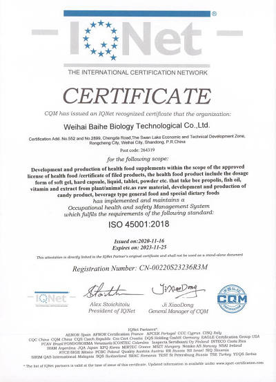Weihai Baihe Biology Technological Co., Ltd (BIOHIGH) fue fundada en 2005, ubicada en la ciudad de Weihai, la parte más oriental de la provincia de Shandong, China. La compañía es una empresa nacional de alta tecnología que se especializa en la investigación, el desarrollo, la producción y las ventas de nutrición y alimentos saludables, con casi 1000 empleados y una superficie de 1148150 pies cuadrados. En la actualidad, la empresa cuenta con dos plantas de producción y ocho plantas de producción digital inteligente, que pueden producir más de 10 tipos de formas de dosificación, incluidas cápsulas blandas, cápsulas duras, tabletas, polvo/sobre, bebida funcional, gotas orales, líquido oral, gomitas, y más de 4000 tipos de productos, con una producción anual de más de 3,7 mil millones de partículas de alimentos nutricionales y saludables. Nuestros productos se exportan a más de 70 países y regiones, como Europa y Estados Unidos. Somos un fabricante de alimentos saludables de renombre mundial.